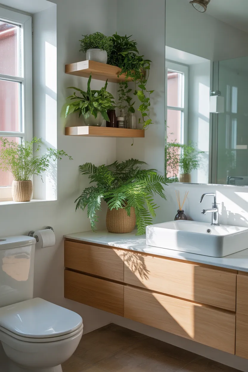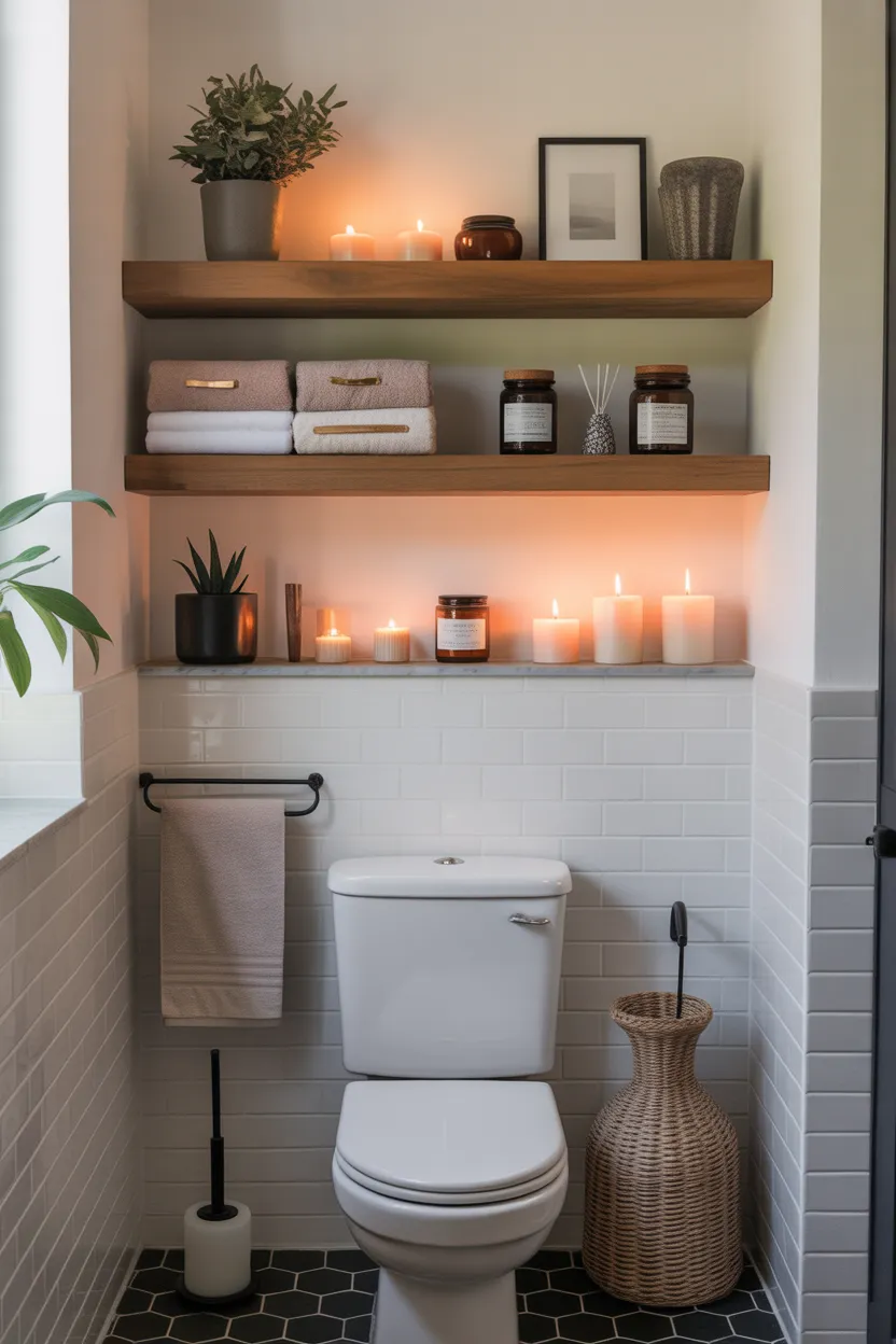 I like floating shelves because they let you display useful things in a cleaner way. Instead of stuffing everything into a cabinet, you can create a setup that looks organized and attractive. That makes the bathroom feel more lived in and less forgotten.