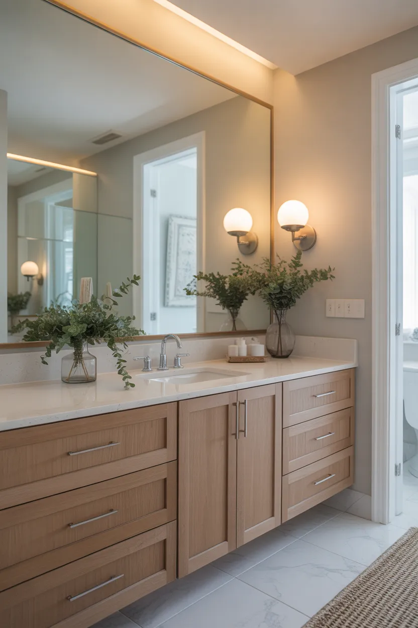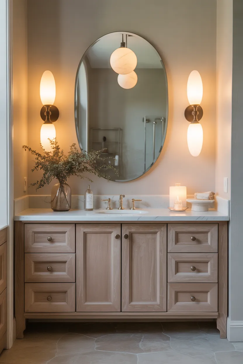 Better lighting usually means layering your sources. Wall sconces beside the mirror work especially well because they spread light across your face more evenly. That makes the bathroom feel softer and look more balanced.