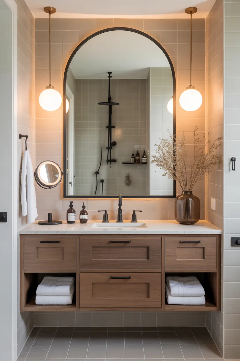 I love statement mirrors because they can anchor the whole bathroom. If the room feels plain, this one change often fixes that. It adds personality without making the space feel overdone.