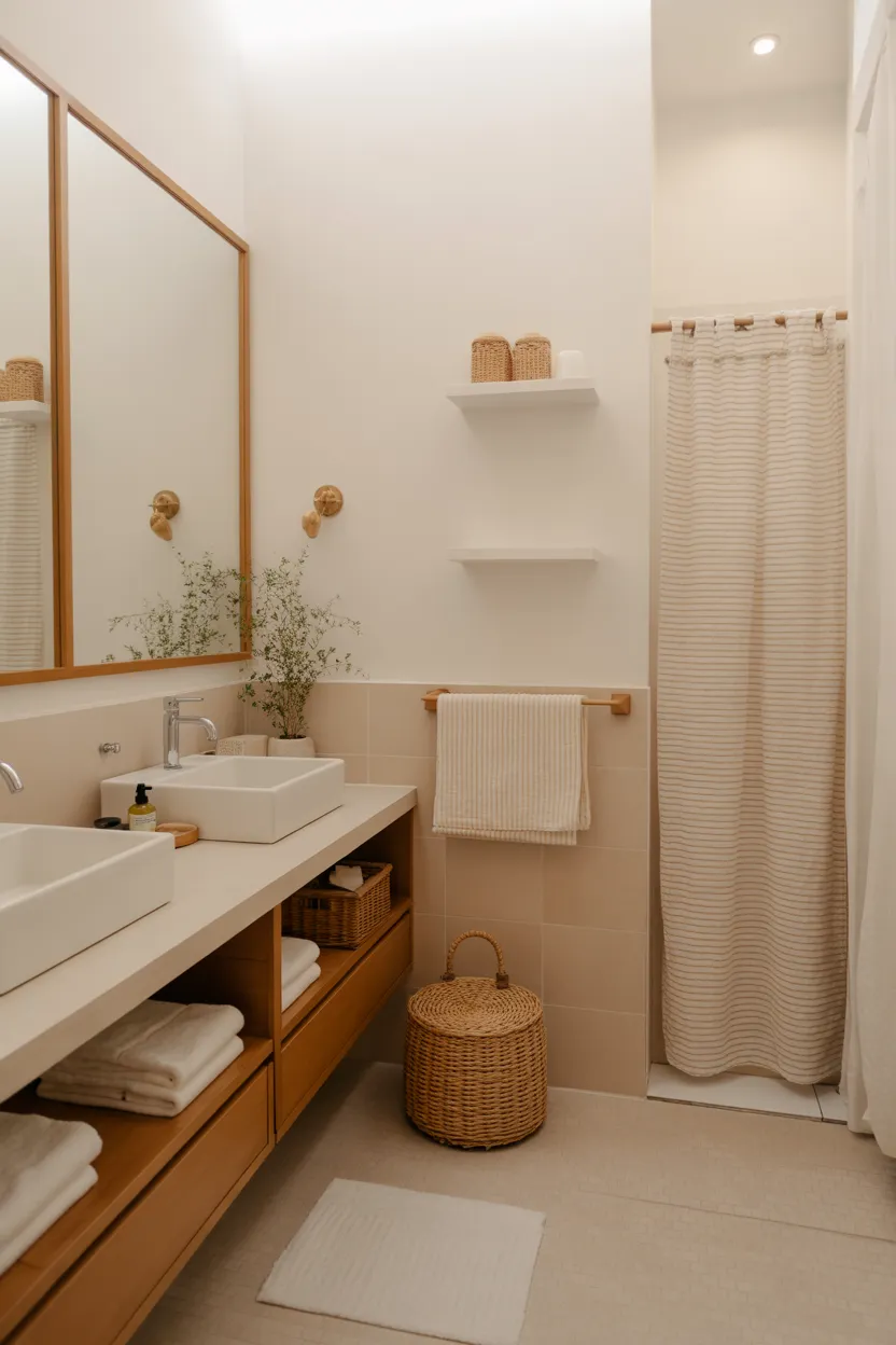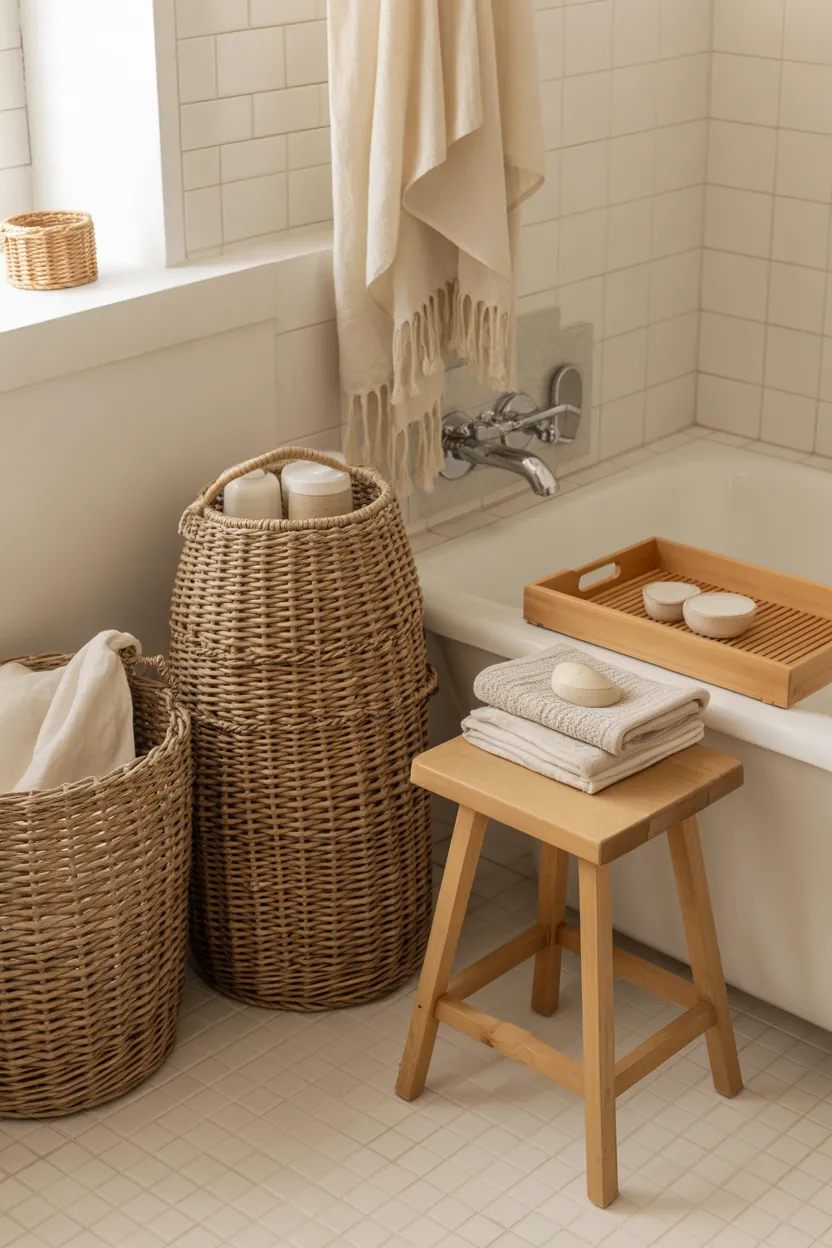 Wood, bamboo, linen, and woven materials all help soften the space. A woven basket, wooden stool, bamboo tray, or linen curtain can instantly make the room feel more welcoming. These elements add visual depth without making the bathroom feel cluttered.
