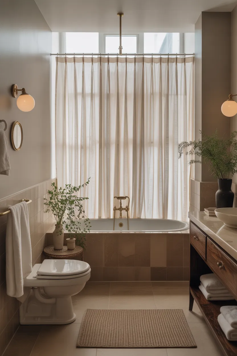A shower curtain can do more than just cover the tub or shower. When you hang it closer to the ceiling, you make the bathroom look taller and more elegant. This visual trick pulls the eye upward and gives the whole room a more finished appearance.