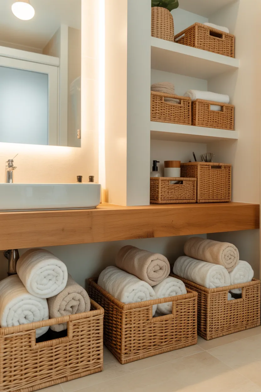 Storage matters, but visible storage matters too. If your extra towels, toilet paper, hair tools, and products sit out in random piles, the room will always look unfinished. Baskets solve that problem while also adding texture and style.