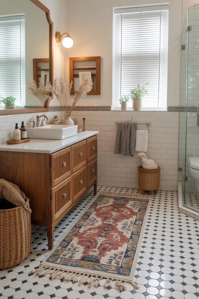 I love using a proper rug in a bathroom because it instantly makes the room feel more decorated. A vintage style runner, a textured woven rug, or a washable patterned rug can change the whole atmosphere. It makes the space feel cared for, not temporary.