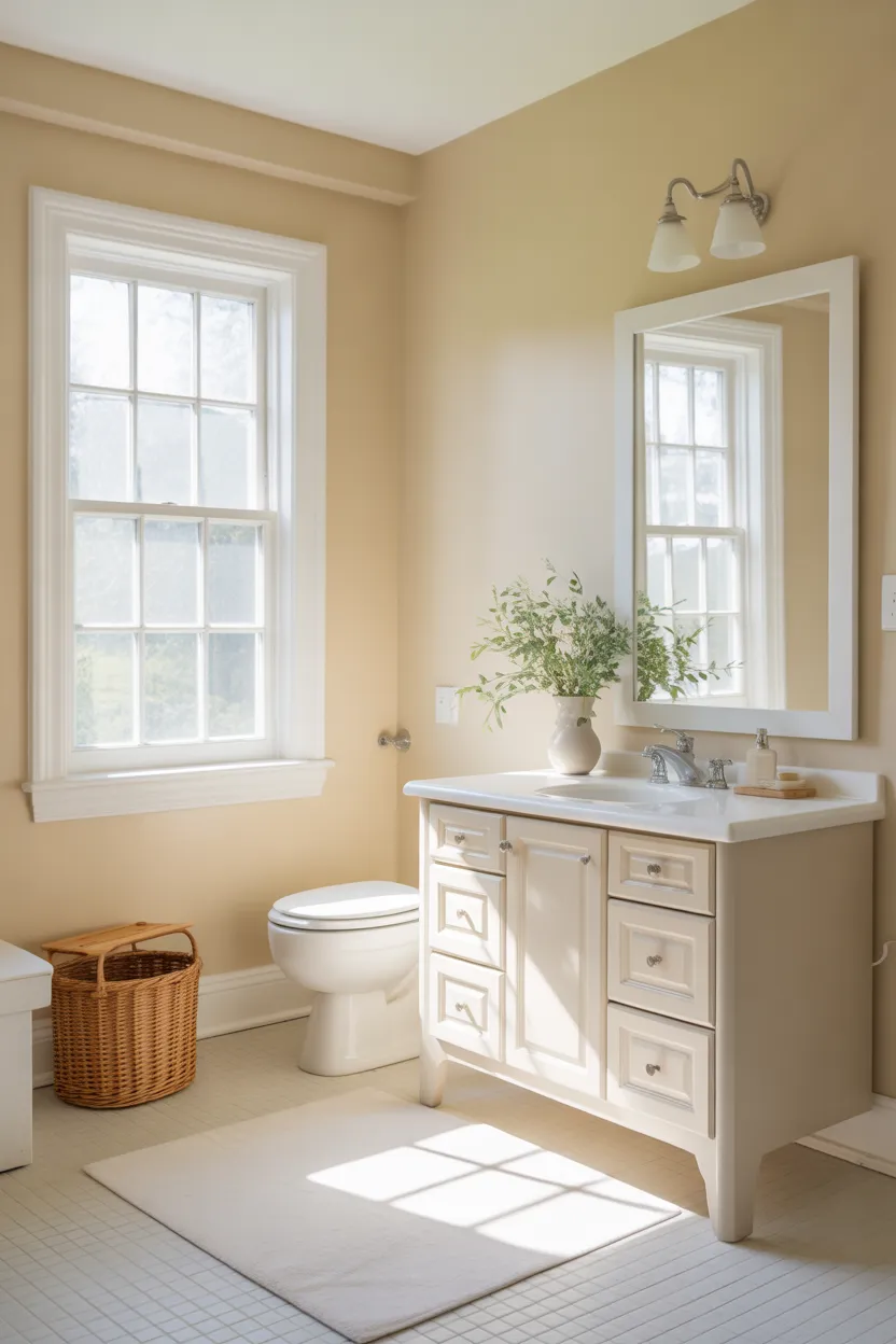 I tend to like calm bathroom colors because bathrooms already have a lot going on visually. Towels, mirrors, counters, fixtures, bath products, and all the random little things can add clutter quickly. A soft wall color helps balance everything out.