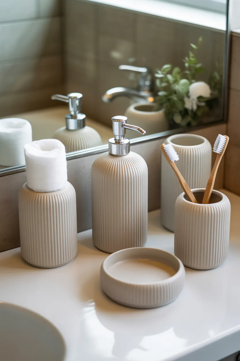 Soap dispensers, lotion bottles, cotton jar holders, and organizers all look better when they coordinate. This creates a cleaner visual line and makes the countertop feel more intentional. You do not need a fancy setup either. Even basic matching pieces can make a difference.