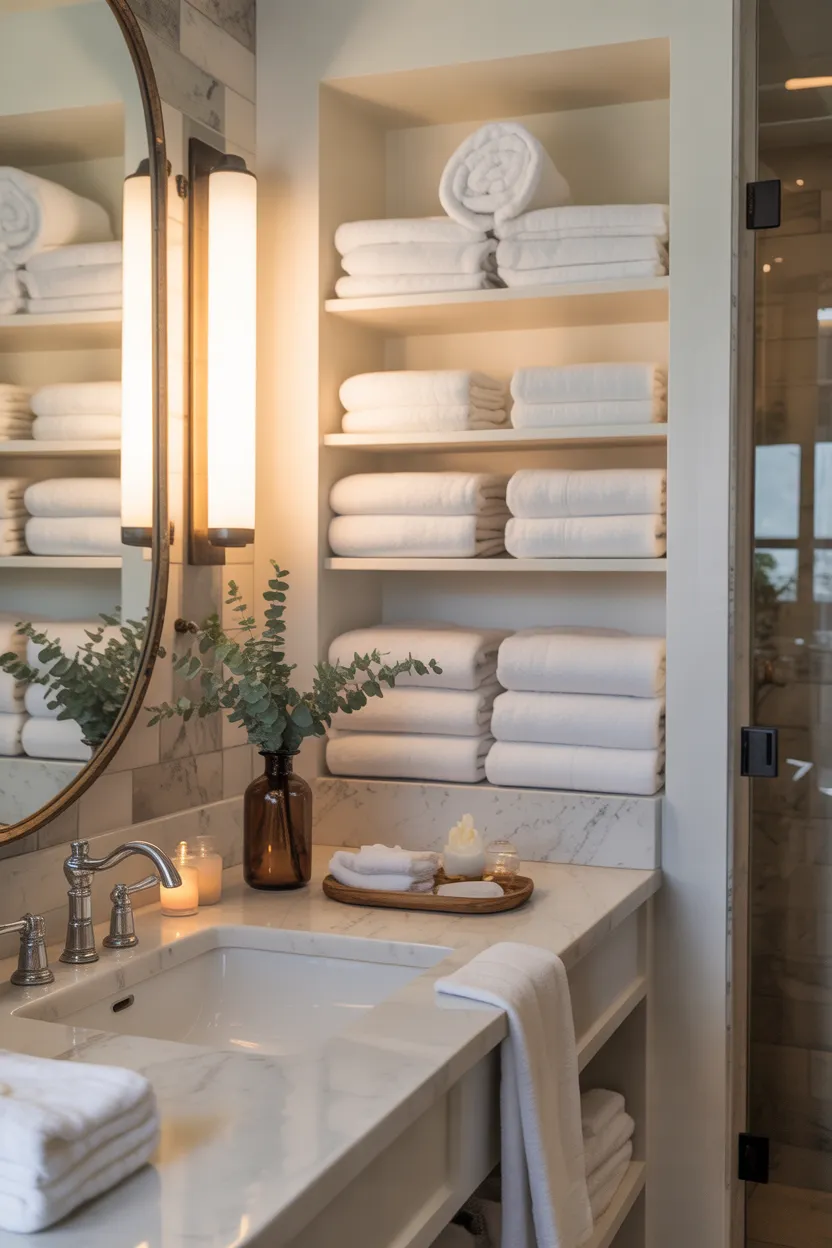This idea works even better if your bathroom already has soft neutral tones. White towels blend in while still adding brightness and softness. They also make folded stacks look more intentional on shelves or in baskets.
