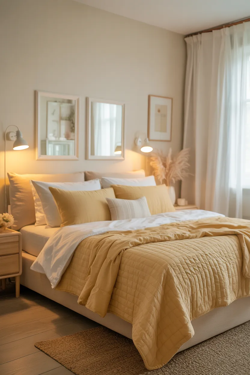 If you want a bedroom that feels light, cozy, and quietly happy, butter yellow and ivory are a very charming choice.