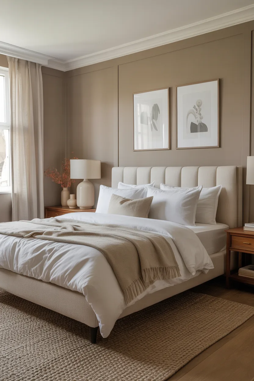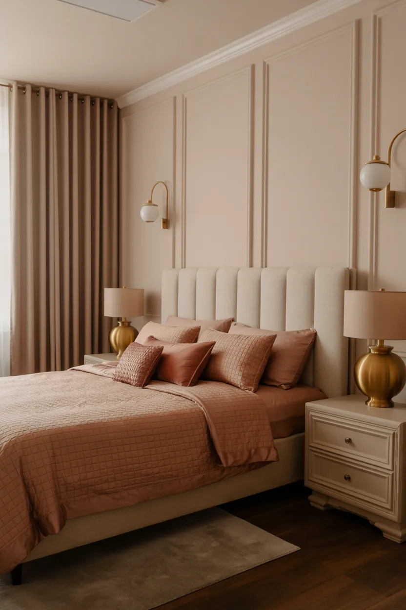 Taupe gives the palette structure and warmth. It tones down the pink and helps the room feel grown up and elegant. That balance makes this color combo a great choice for couples who want the bedroom to feel warm and romantic without becoming overly sweet.