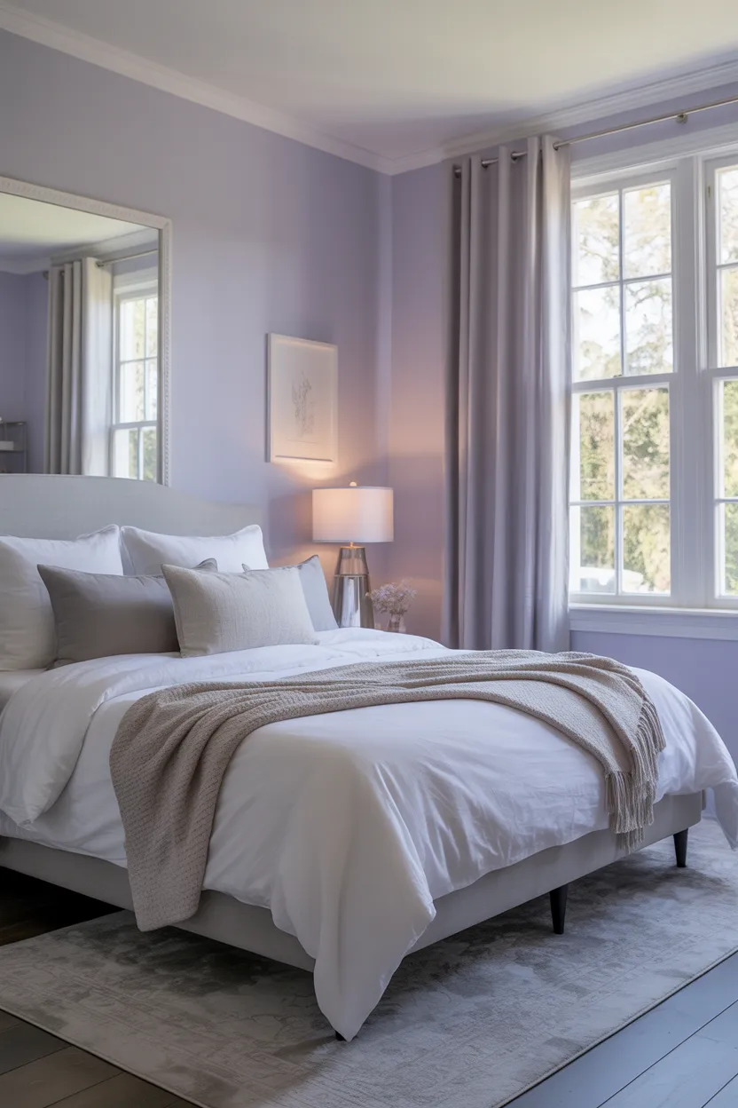 I like this palette because it adds a gentle twist to a neutral bedroom. Standard gray can sometimes feel a little flat on its own. Lavender gray gives it more charm and softness without making the room feel too feminine or overly decorative.
