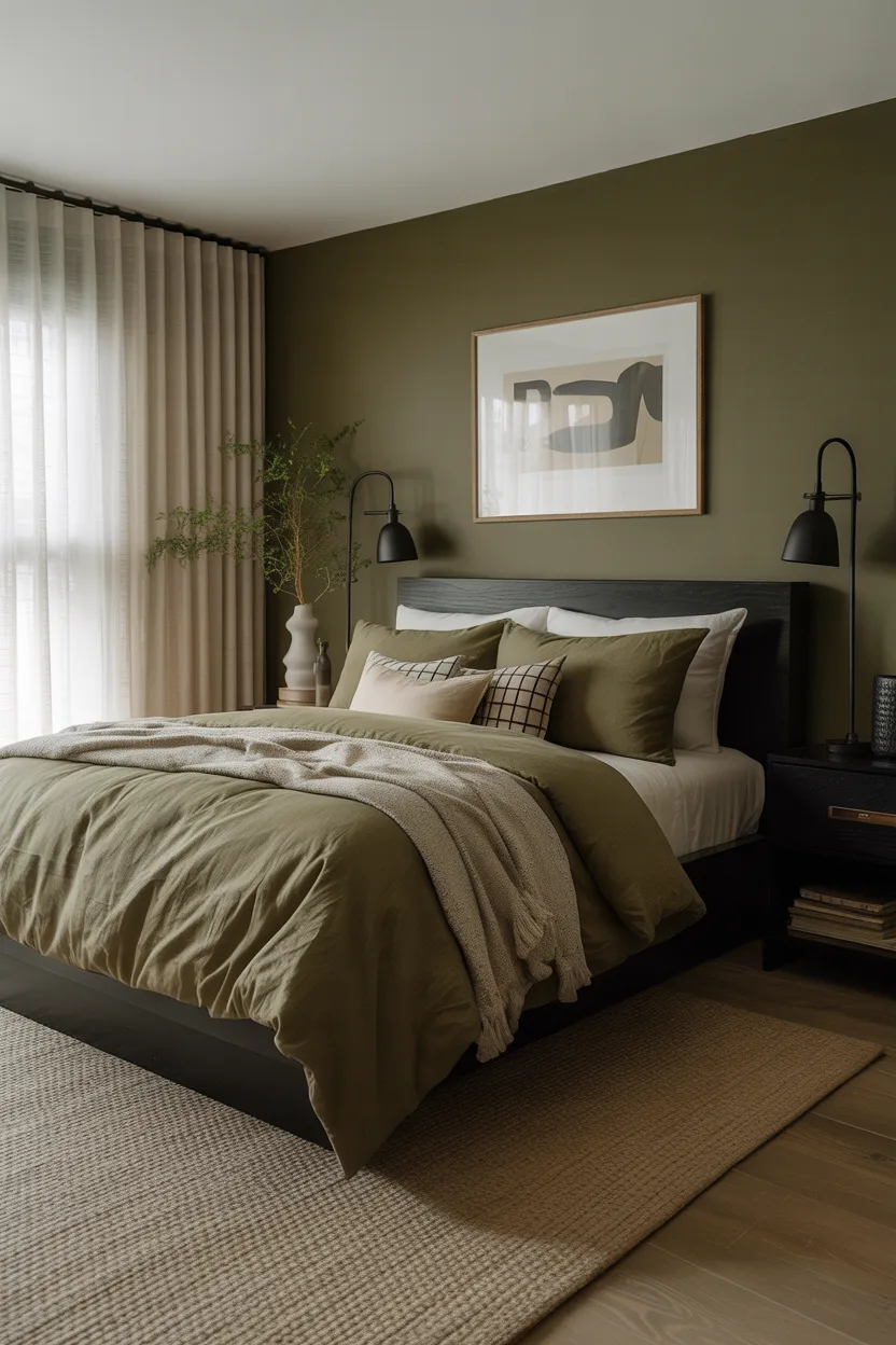 Olive green and black create a bedroom with personality. This palette feels bold, modern, and a little edgy, but it still has enough warmth to feel inviting. It works best for couples who like strong decor choices and want their bedroom to stand out.