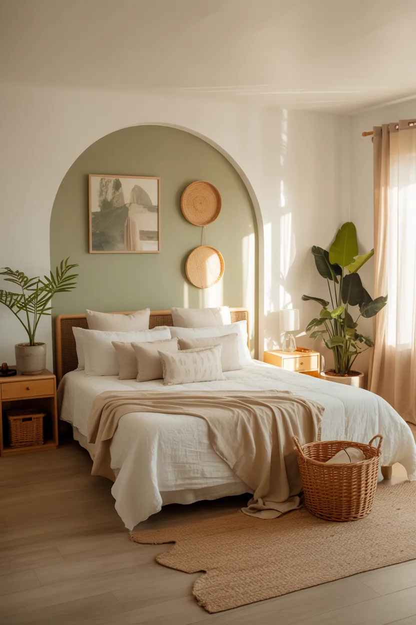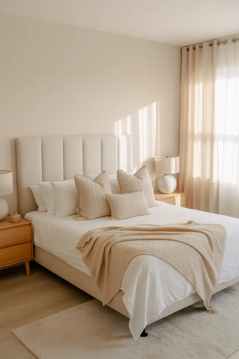 You can also layer different textures to keep the room from looking flat. Think linen bedding, a chunky knit throw, a boucle bench, or woven baskets. When the colors stay neutral, texture does a lot of the heavy lifting.