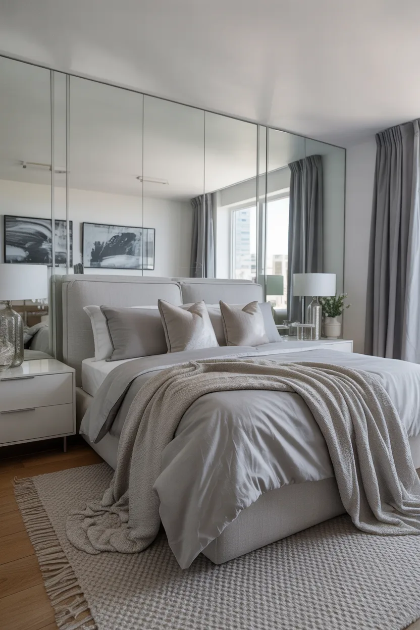 Silver gray and white create a bedroom that feels sleek, polished, and open. This combo works especially well in modern apartments or smaller bedrooms where you want a clean stylish look without visually crowding the space.