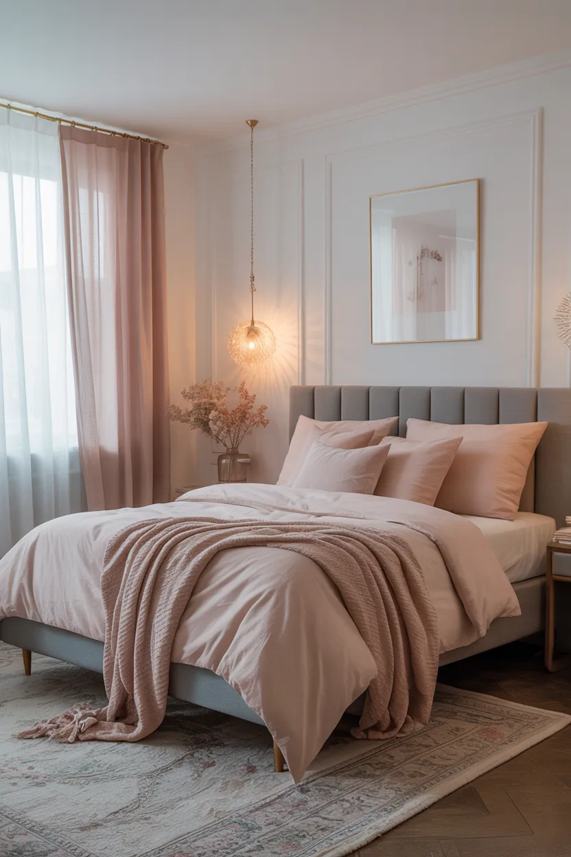 If you want a bedroom that feels romantic, soft, and easy to live with, soft pink, gray, and white are a very safe and beautiful choice.