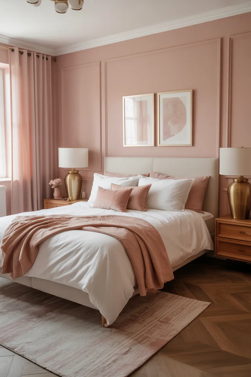 I like blush pink with ivory bedding, natural wood, and simple brass details. It creates a subtle layered look that feels pretty without becoming overly precious. You can also style it in a modern way with black accents if you want a little contrast.