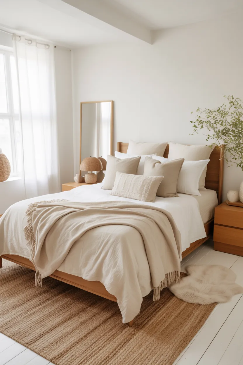 On its own, bright white can feel a little harsh in a bedroom. Add warm wood, cream bedding, textured throws, woven accents, and soft lighting, and suddenly it feels fresh instead of cold. That contrast makes the room feel open and comfortable at the same time.