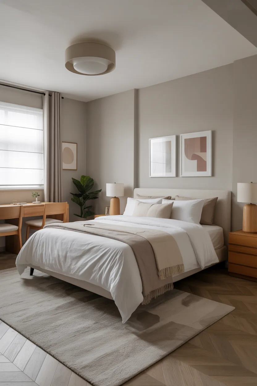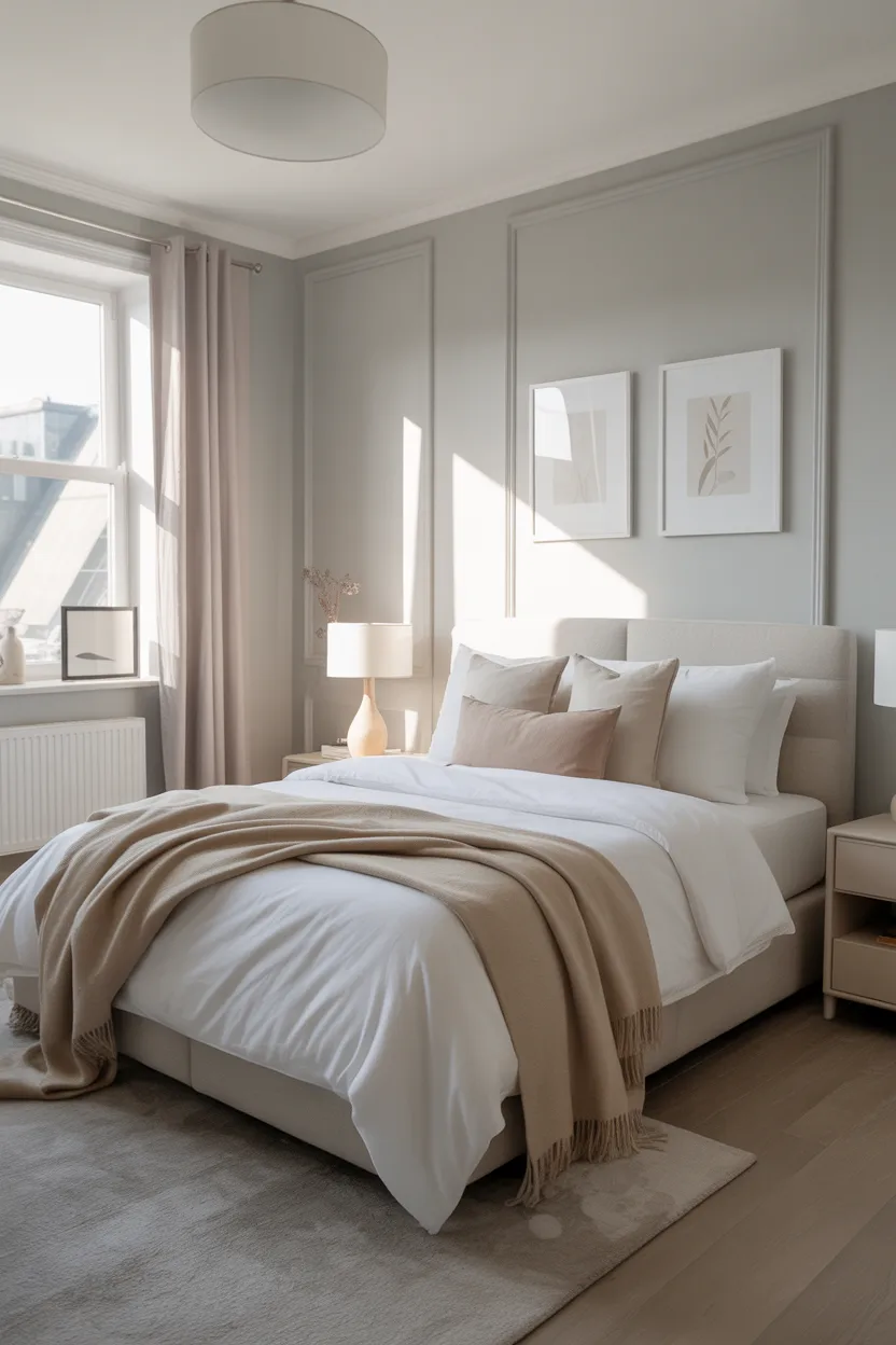 I think light greige works best when the rest of the room stays simple. White bedding, warm wood, and a few textured accents can make it feel very polished. It is especially good for people who want a mature, minimal look without making the room feel lifeless.