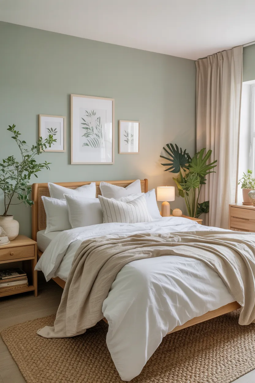 Sage works especially well when you want a bedroom that feels peaceful and slightly organic. It has that soft natural vibe that pairs beautifully with wood furniture, cream textiles, and plants. Even one small plant on a bedside table looks more intentional with sage walls behind it.