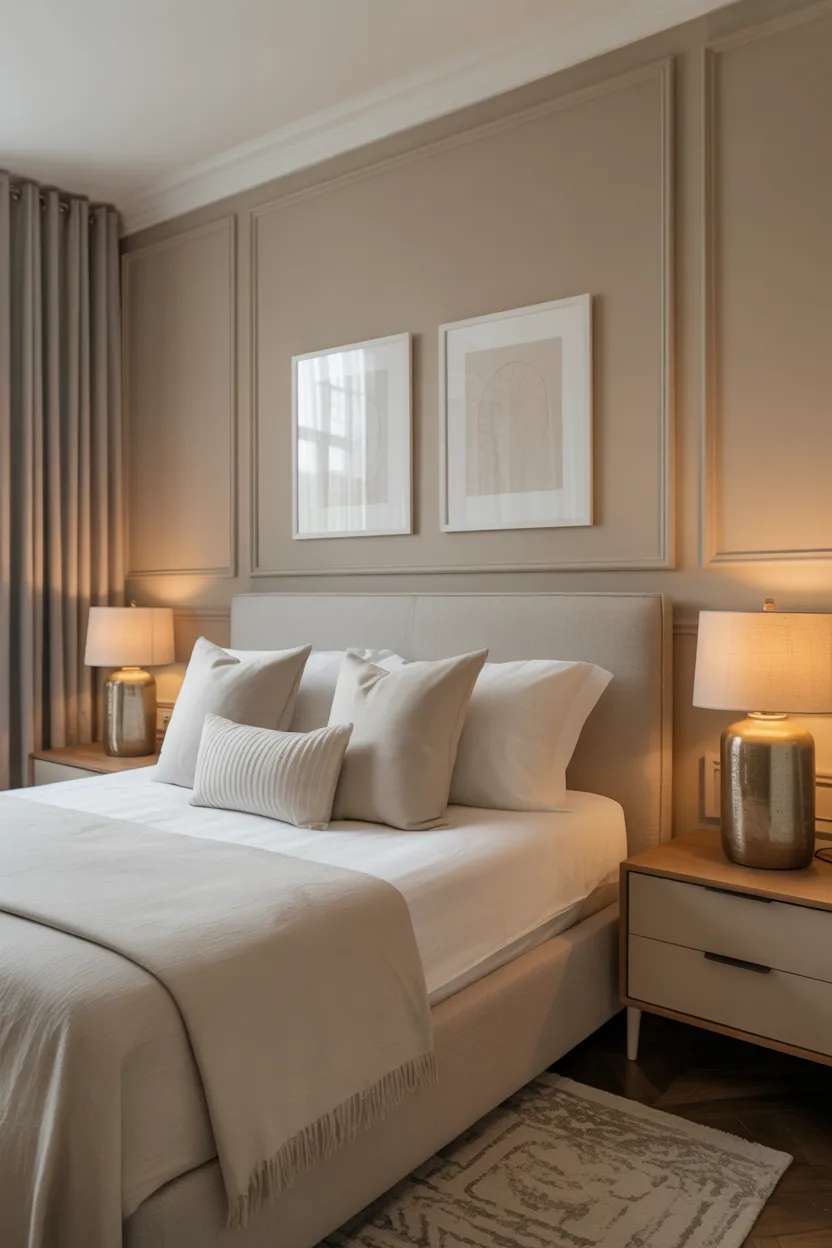 I like light taupe with white bedding, textured pillows, and warm bedside lighting. It creates a very polished and restful atmosphere. If you want a bedroom that looks elegant but still relaxed, this one does the job really well.