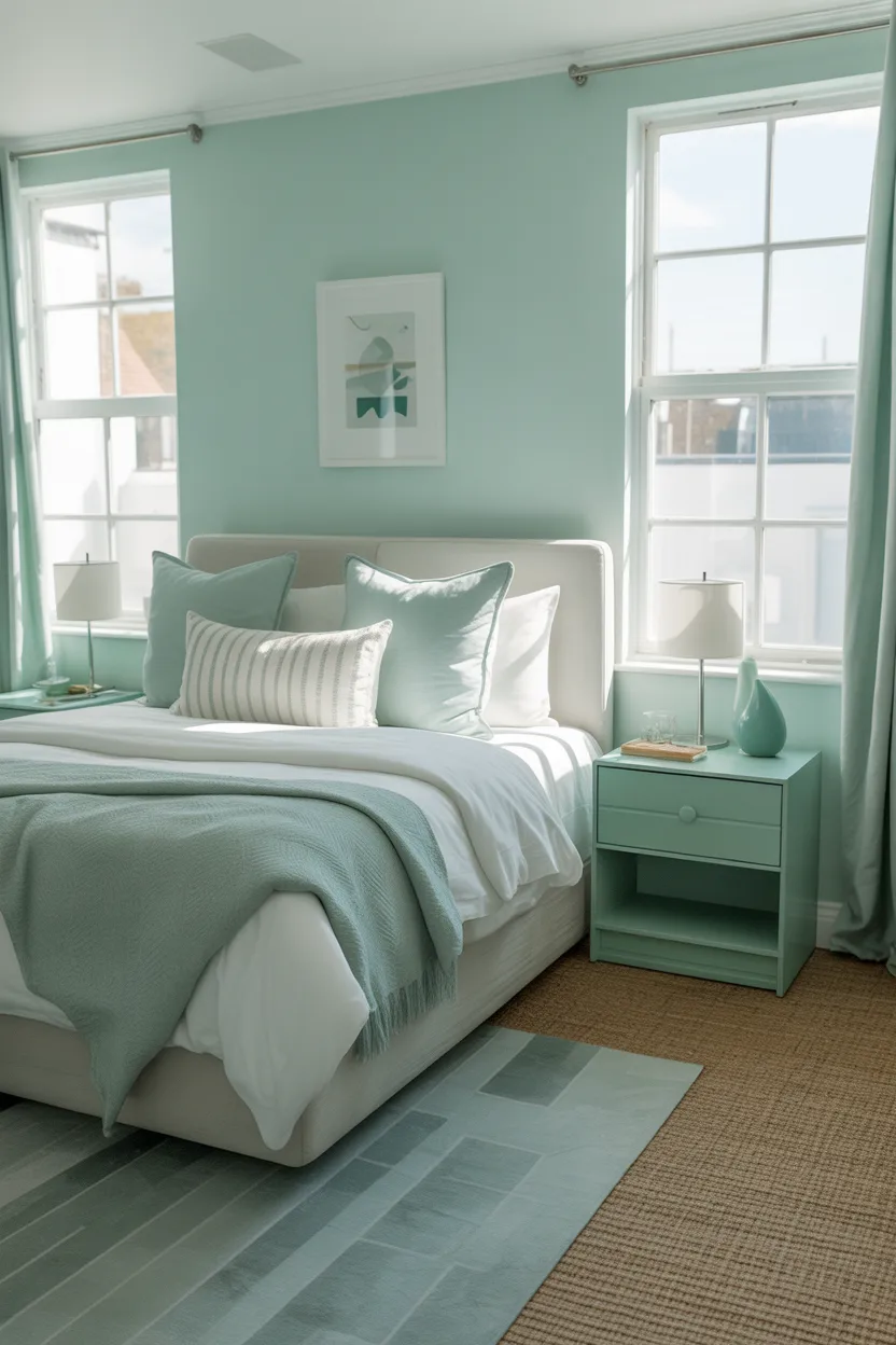 I like misty aqua with crisp white bedding and simple decor. It does not need much help. A few clean lines, some soft textiles, and a decent lamp can make the whole room feel pulled together. Honestly, that is ideal because not every room needs fifteen decorative objects staring at you from every corner.