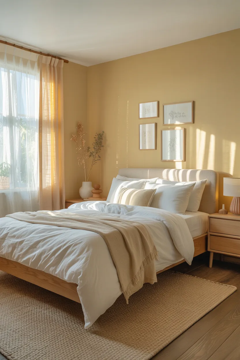 I really like pale butter yellow in small rooms that do not get much natural light. It can mimic that soft daylight warmth and make the whole room feel less gloomy. Paired with white bedding and light wood furniture, it looks bright and welcoming.