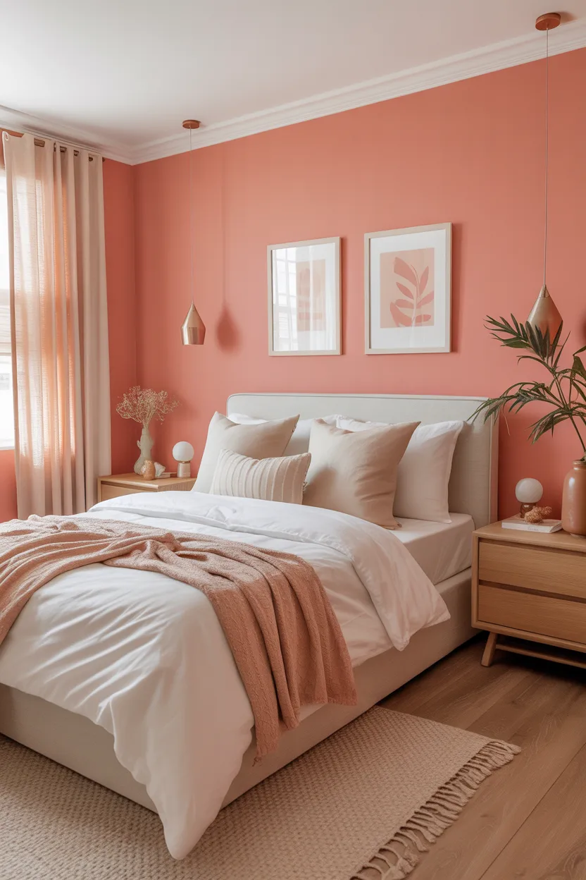 Pale coral adds a cheerful spark to a small bedroom without taking over the whole space. It feels warmer and a little more energetic than blush pink, but it still keeps the room soft and open.