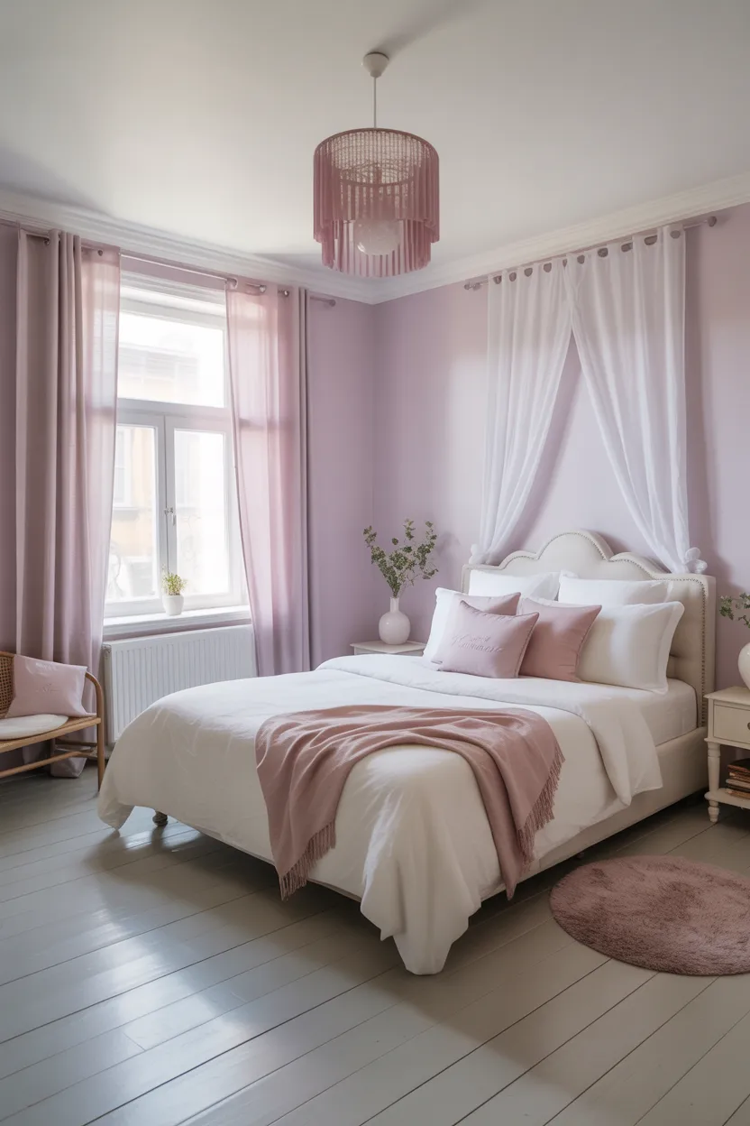 I like it best with white trim, light bedding, and simple decor. That keeps the focus on the softness of the wall color instead of piling on too much theme. Nobody needs a room that looks like a grape candy wrapper.