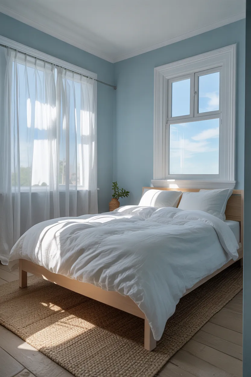 Pale sky blue helps expand the room visually while creating a calm, airy mood.