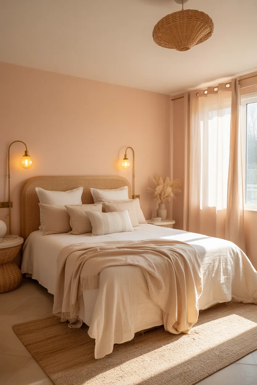 Peachy nude creates warmth, softness, and an open feel that works beautifully in compact bedrooms.