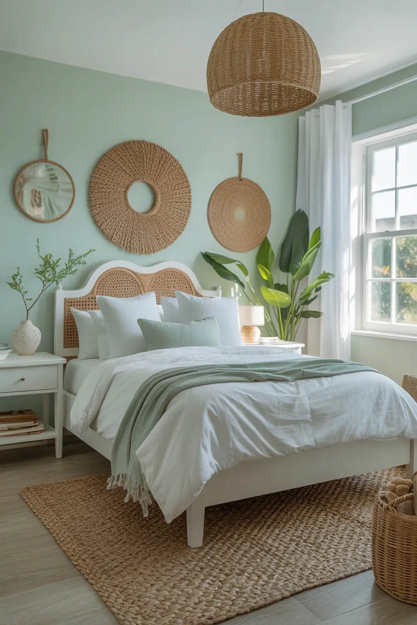 I love seafoam green with white furniture, natural fibers, and simple art. It gives the room a relaxed, effortless feel that works especially well in spaces where you want a little personality without a lot of visual noise.
