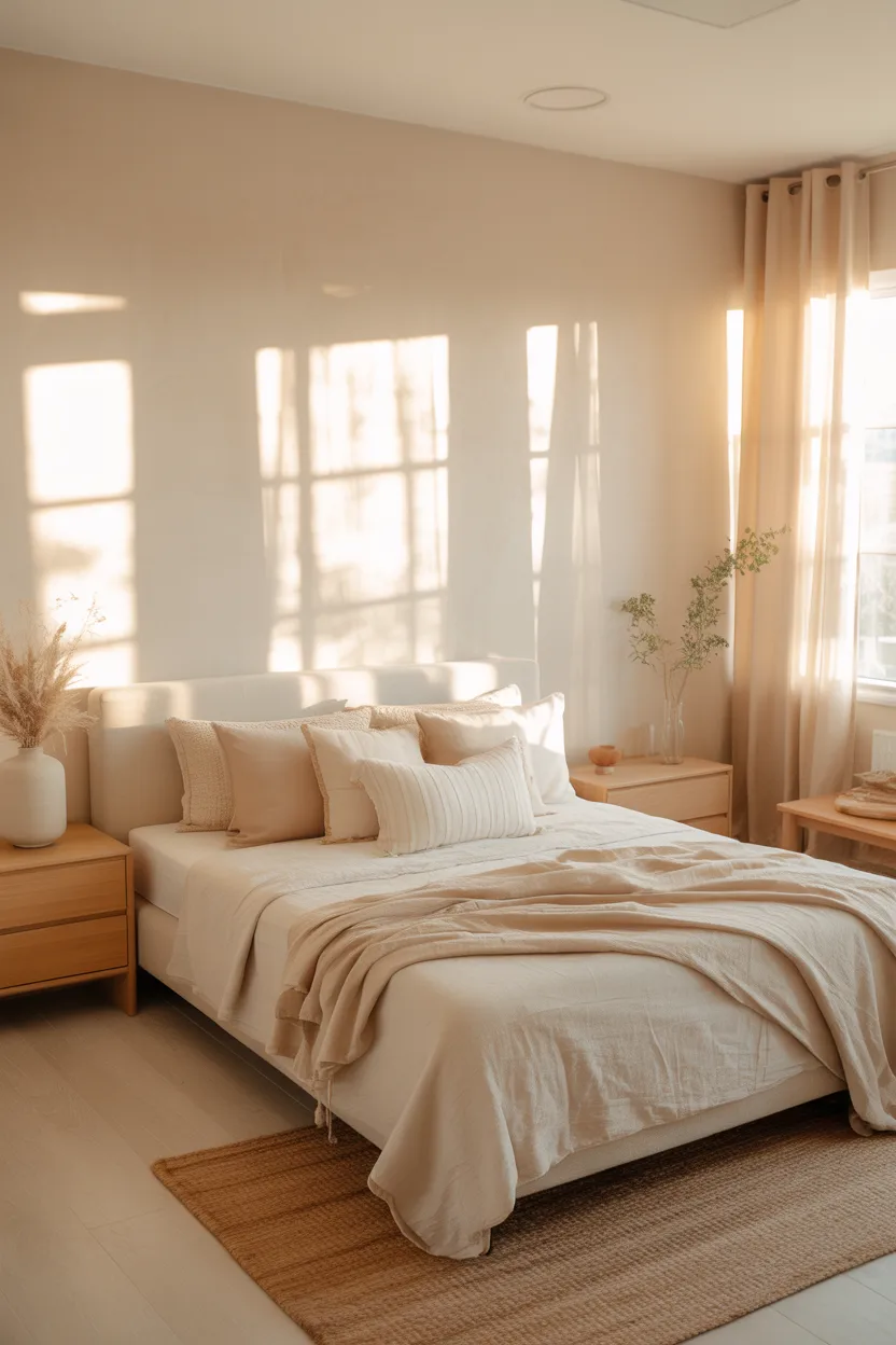 I love creamy ivory with layered neutral bedding, brushed gold accents, and soft curtains that let light filter through. The result looks bright and expensive in that calm, understated way. Not flashy. Just really pretty.