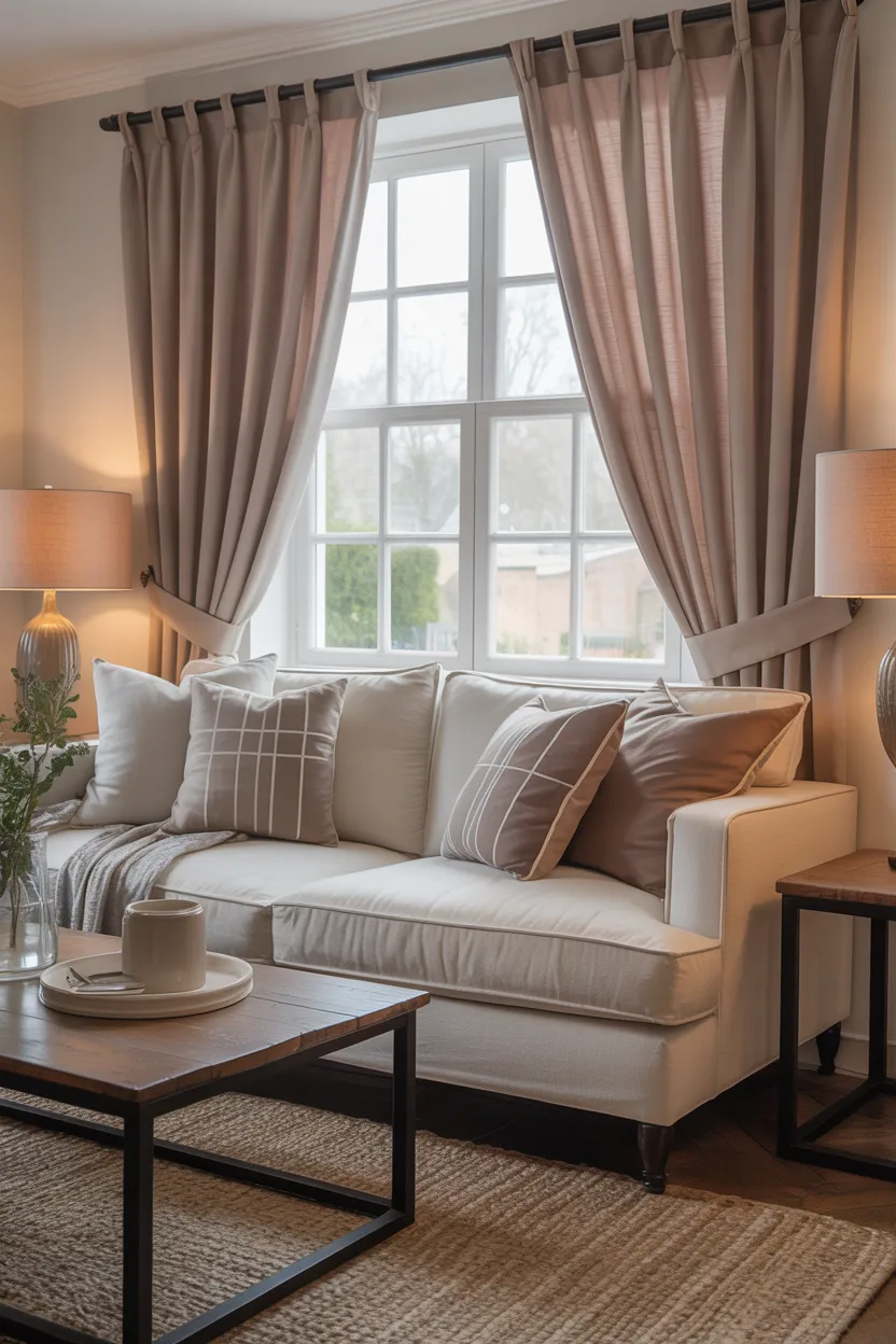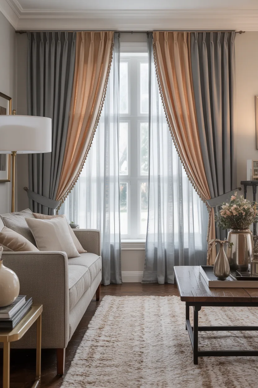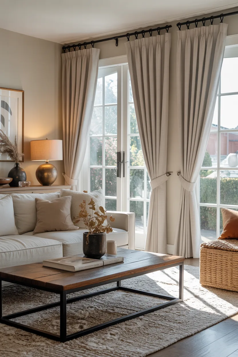I love this look in transitional living rooms because it bridges different tones so nicely. If your room includes both cool and warm elements, these layered curtains help everything feel more intentional.