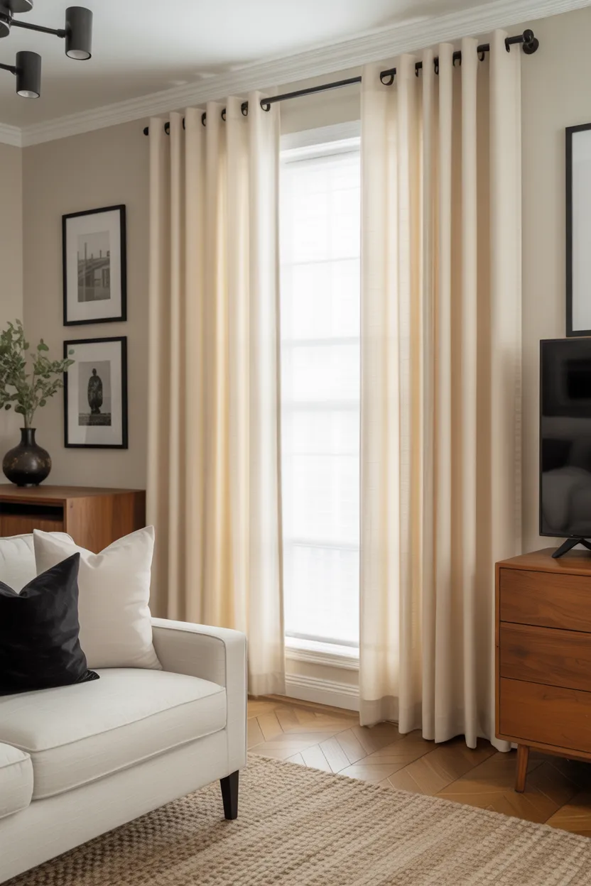 If your room has warm woods, cream fabrics, and brass accents, warm curtain colors will usually look better. If your room leans cooler with gray, black, and crisp white, cooler neutrals may work better.