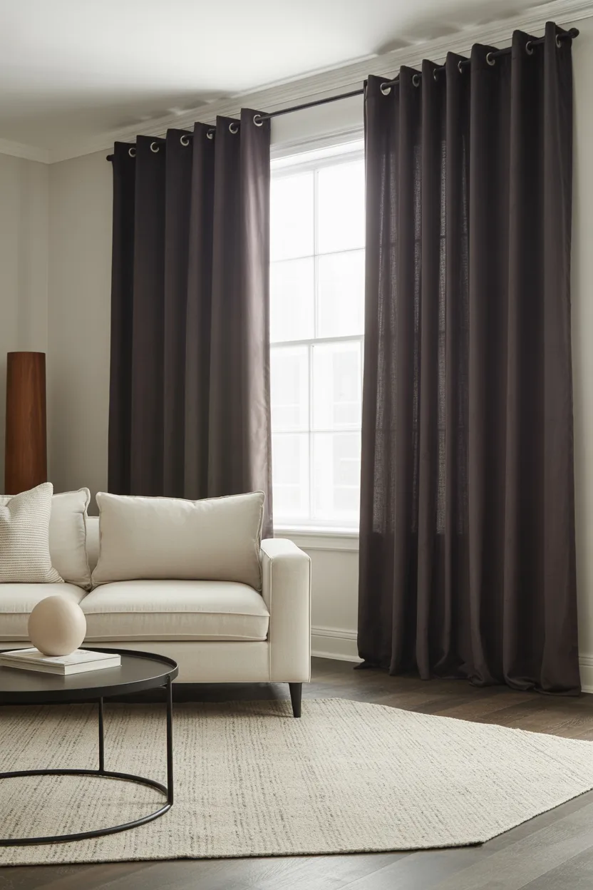 Dark charcoal curtains can make a neutral living room look much more refined. They add contrast, depth, and a slightly moody edge that feels sophisticated without going full dramatic movie set.
