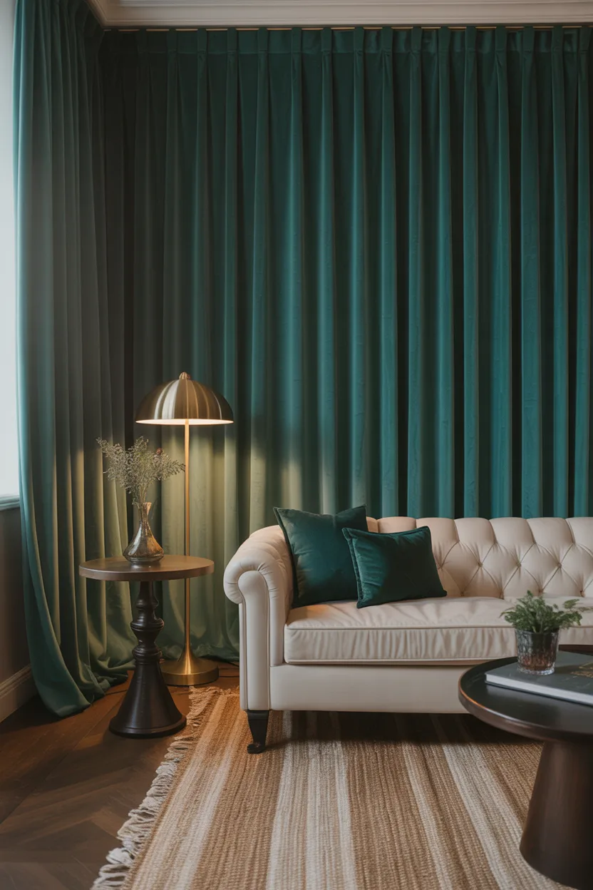 I love jewel tones most in living rooms with neutral furniture because they stand out beautifully without making the space feel crowded. One bold curtain color can completely wake up the room.