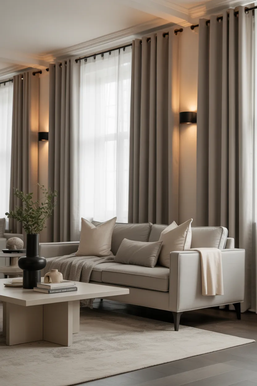 21. Beige and Gray Layered Curtains for a Balanced Look