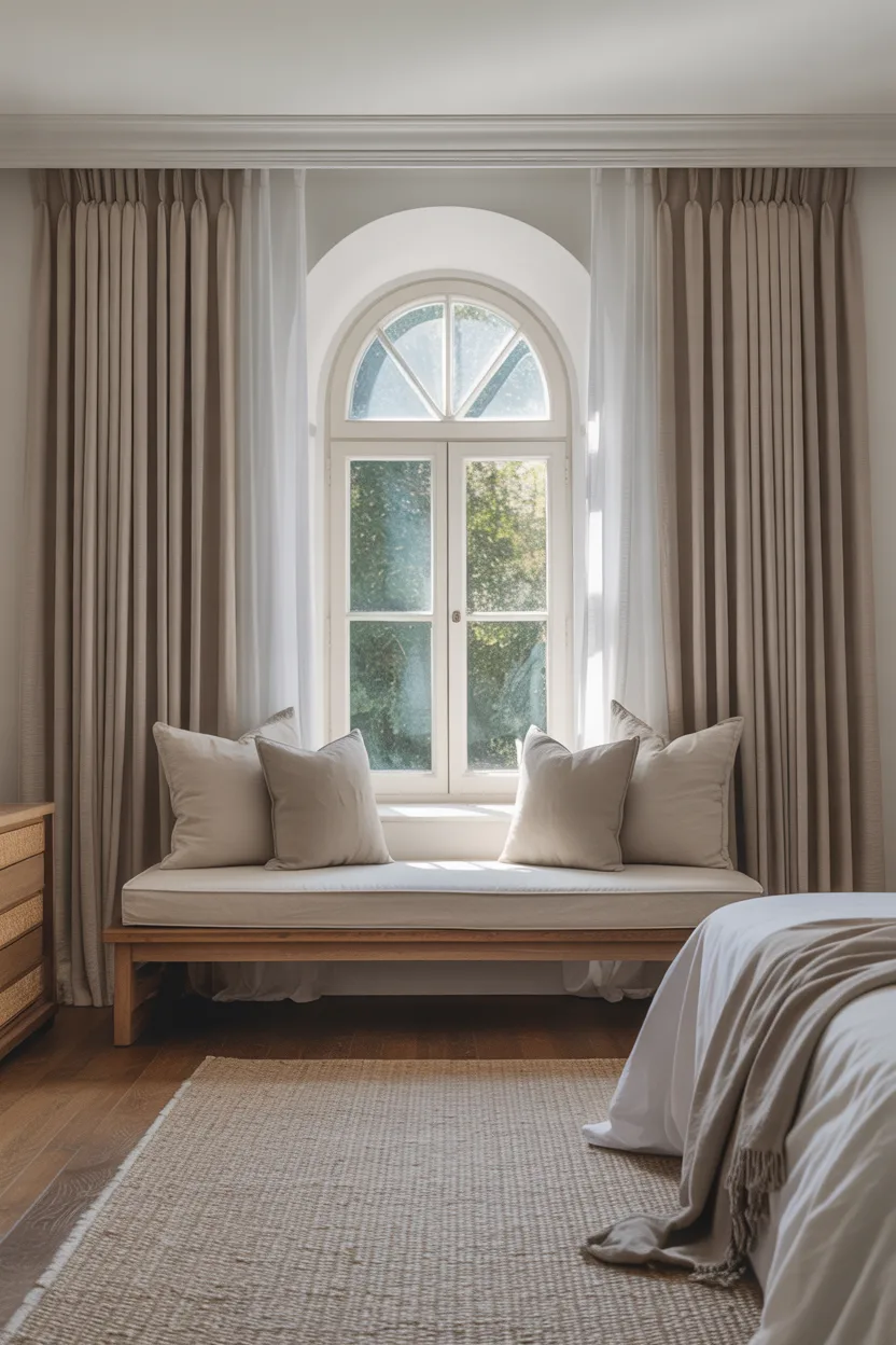 I like using low dressers, benches, streamlined sofas, or compact side tables near curtained windows. This leaves more open wall space, which helps the room breathe. The window treatment looks stronger when it does not have to fight for attention.