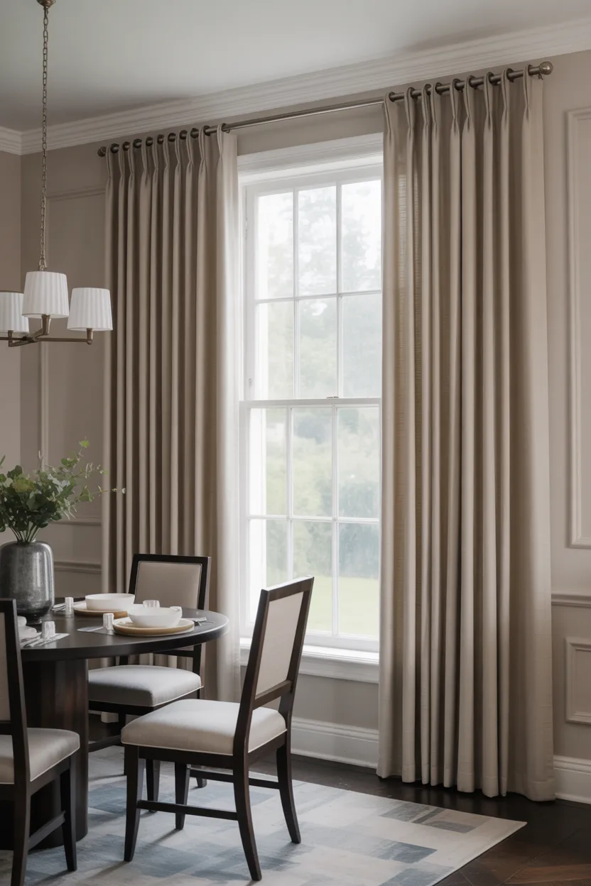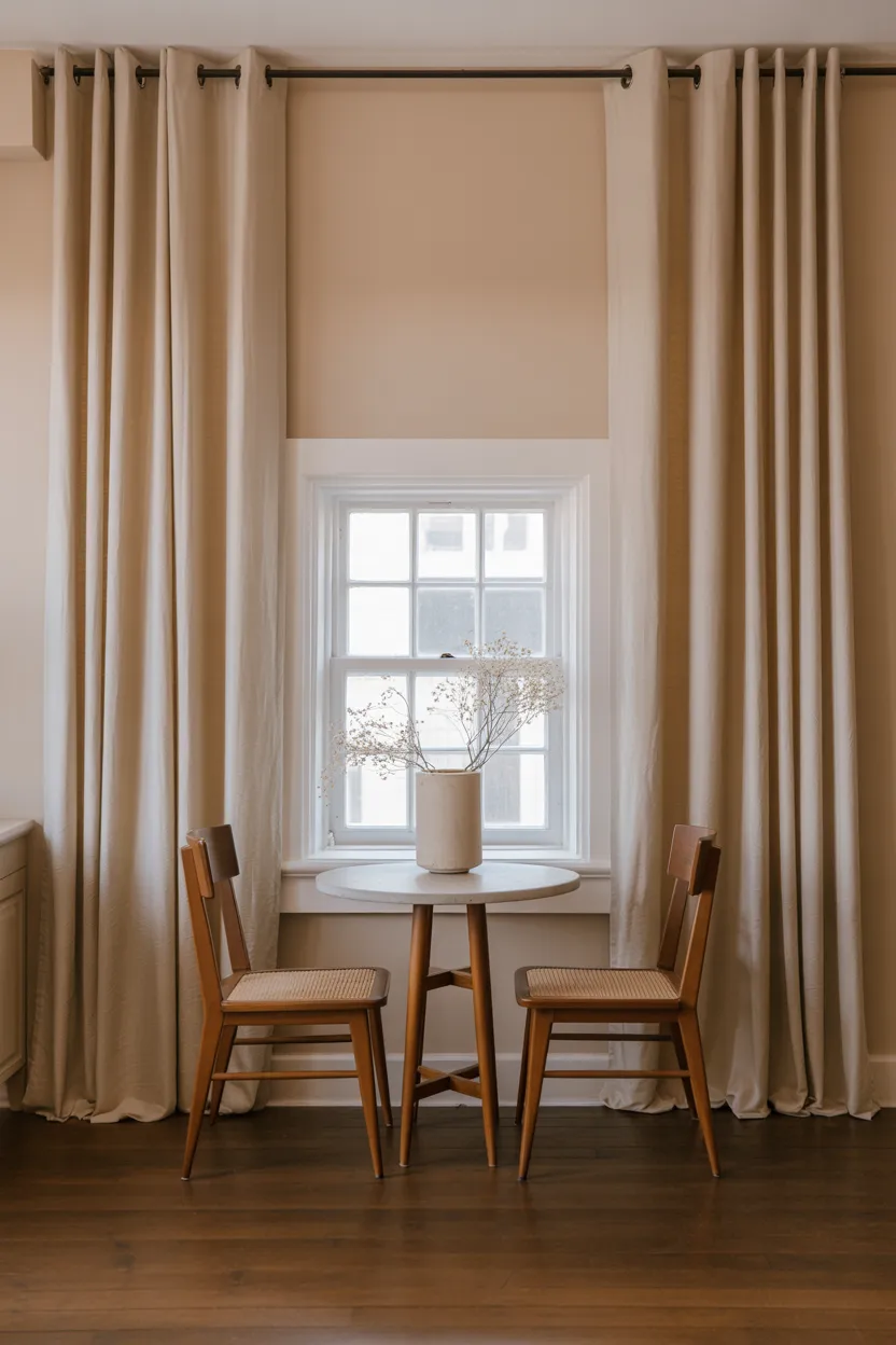 That blended effect makes the room feel calmer and taller. I love soft whites, ivory, greige, beige, warm taupe, and muted gray for this reason. The curtains do their job without chopping the wall into sections.