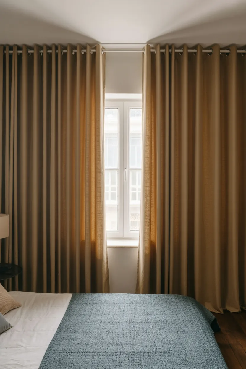 If your goal is height, high contrast is not always your best friend. Dark curtains against pale walls can look striking, but they can also break up the wall visually. When you choose curtains in a color close to the wall color, the whole area reads as one longer vertical surface.