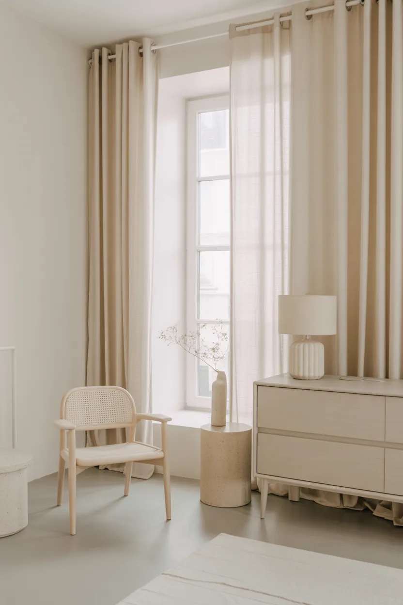 This works especially well in modern, minimalist, and calm neutral spaces. Think white walls, ivory curtains, pale wood furniture, and a few soft accents. The look feels clean, relaxed, and more expensive than it probably was.