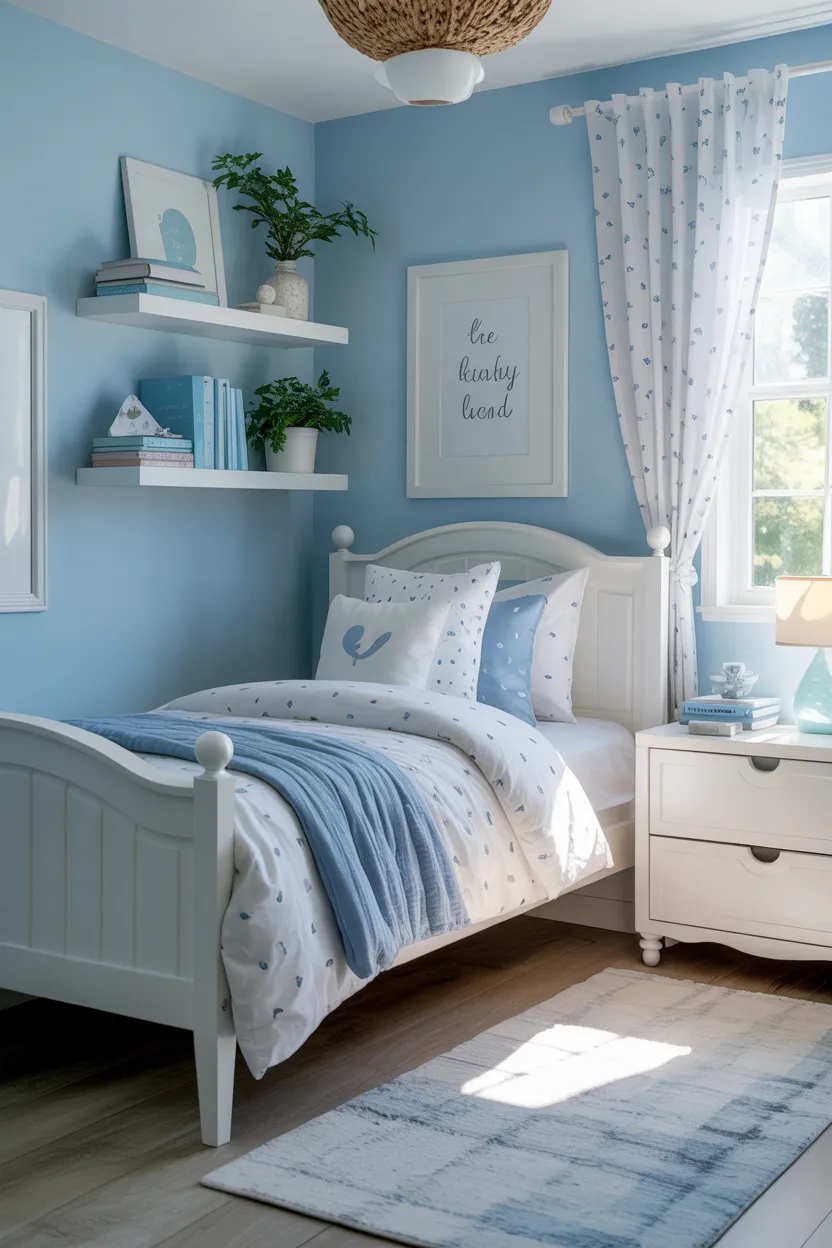 Sky blue gives a bedroom a light and breezy feeling that instantly makes it feel more open. It is one of those colors that can make even a smaller room feel calmer and more spacious, which is always helpful when the bedroom is doing the job of sleep space, homework corner, and personal hideout all at once.