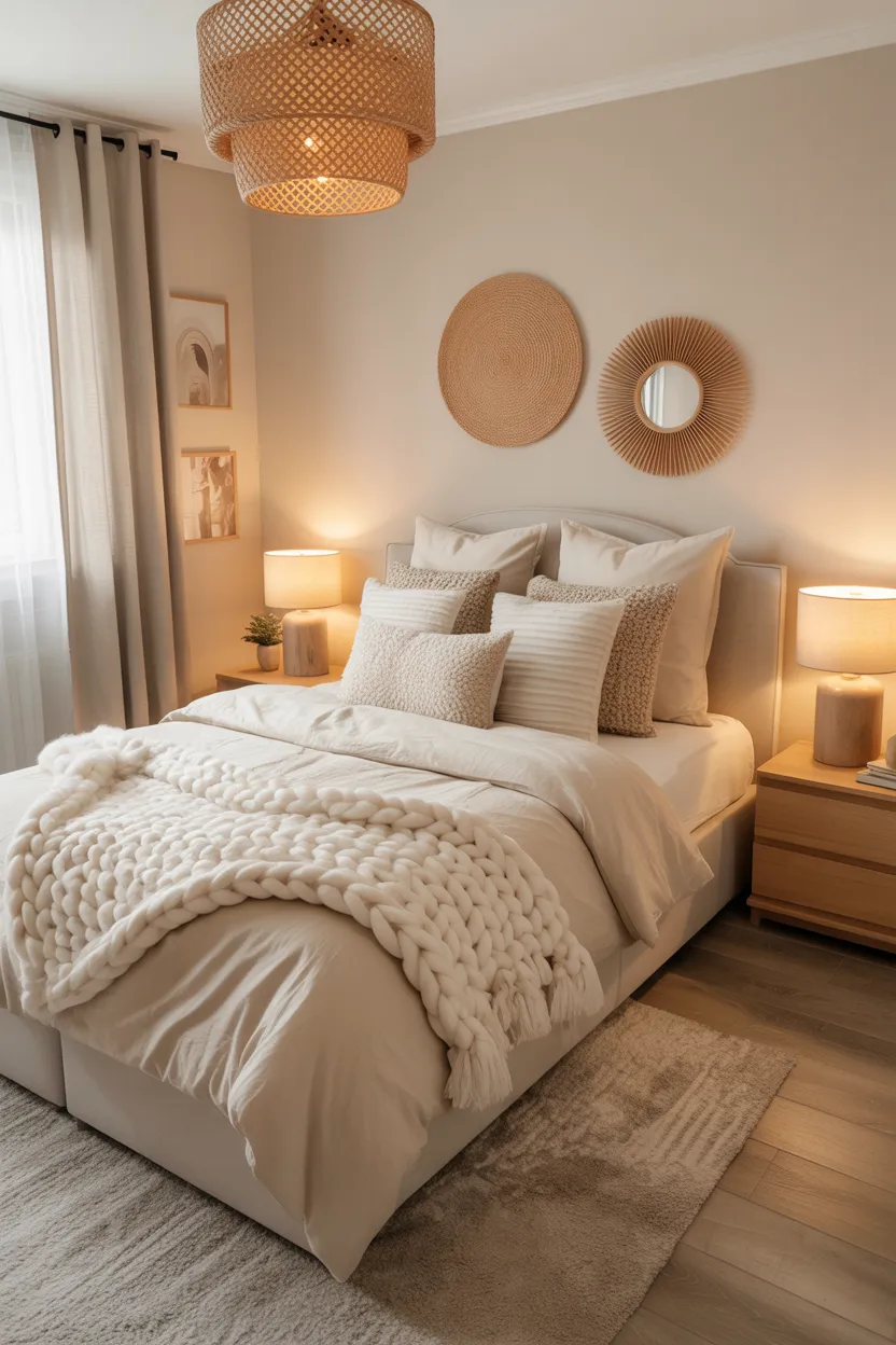 Texture keeps a room from looking flat. Rugs, blankets, curtains, cushions, and woven storage pieces all help add depth. This matters even more in neutral rooms where texture often does the job that bold color would normally do.