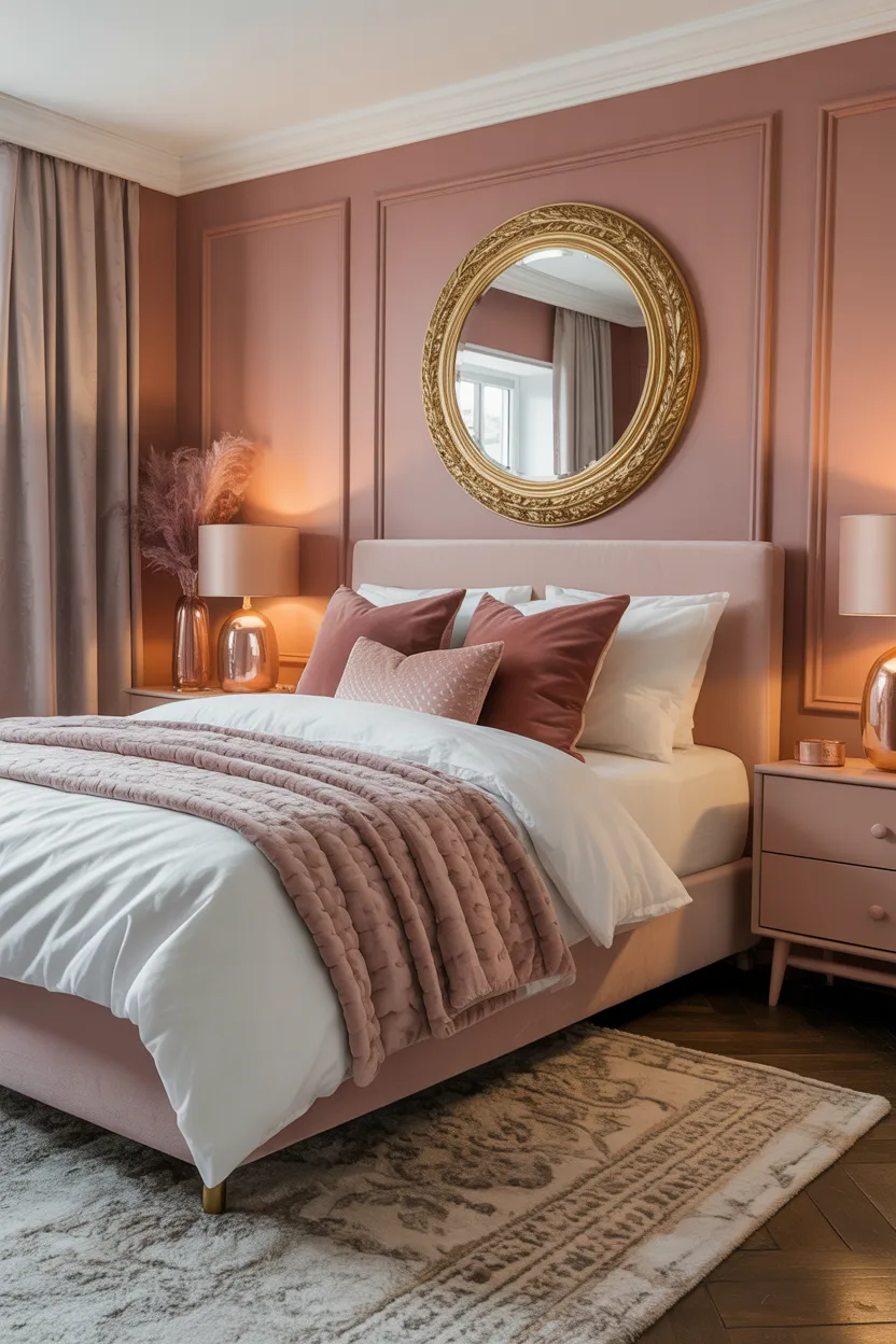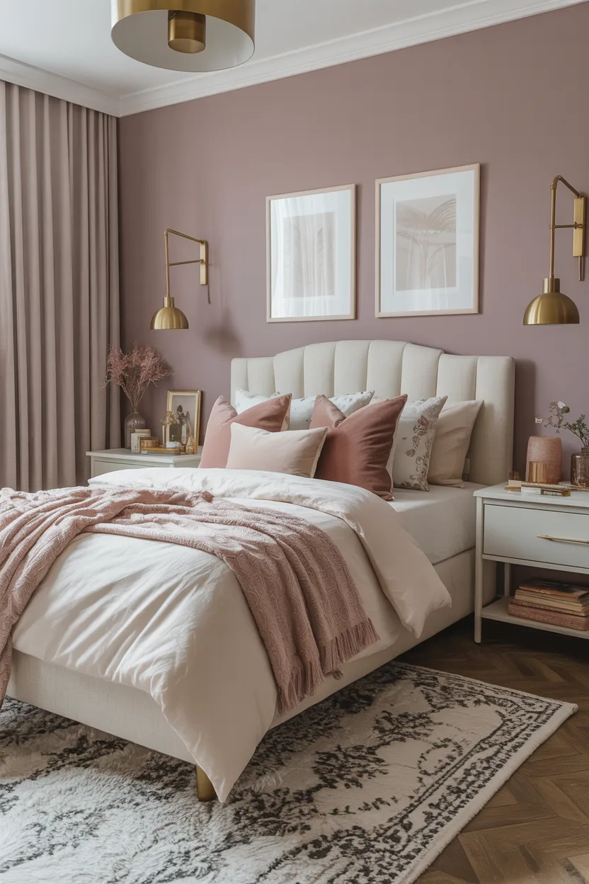 I think dusty rose looks especially pretty with cream bedding, taupe curtains, and brass or gold decor. It can also pair nicely with white furniture if you want a brighter look. The color has enough depth to stand on its own, so the room still feels interesting even if you keep the decor simple.