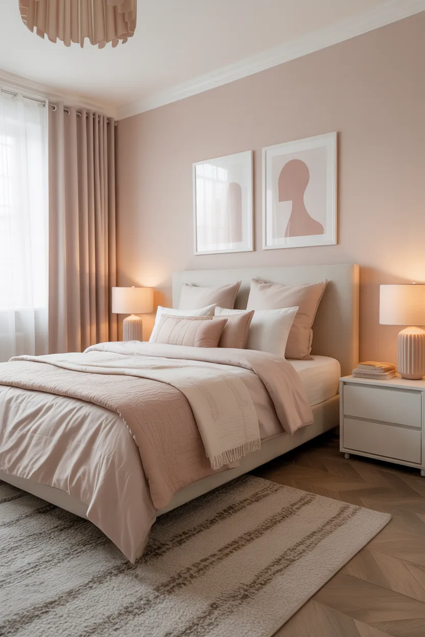 If you want a bedroom that feels calm, cute, and modern, nude pink is a really lovely option.