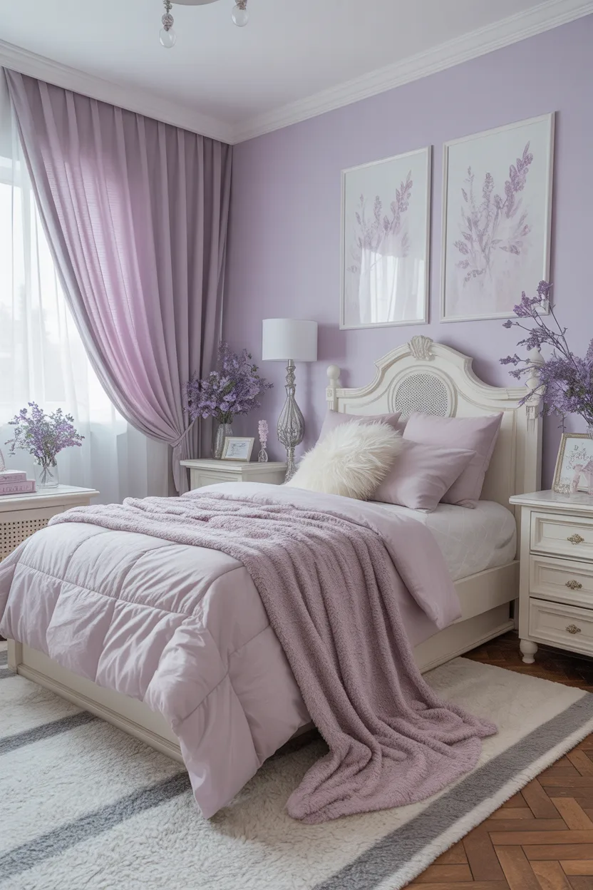 This shade looks especially nice in bedrooms with delicate details like sheer curtains, floral bedding, or softly layered pillows. You do not need to overdo it. Lavender already has personality, so a few thoughtful pieces can make the whole room feel finished without making it look too busy.