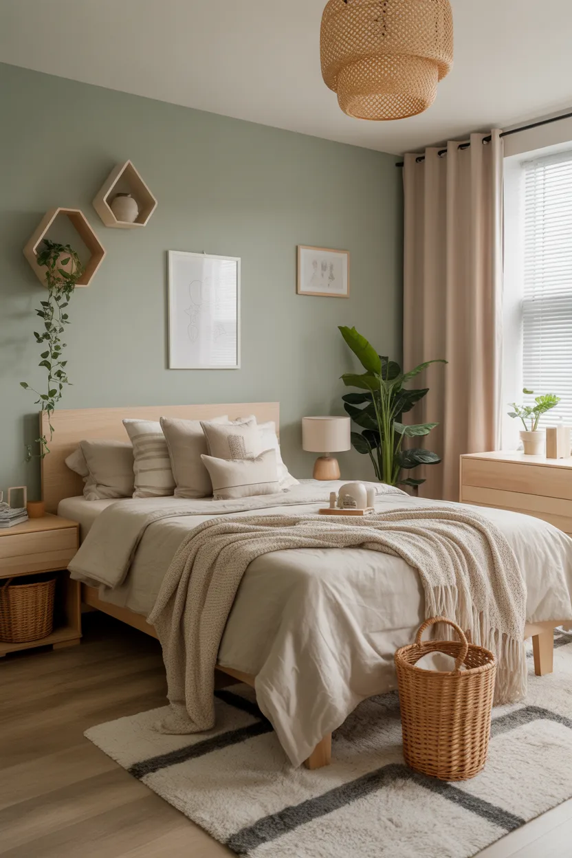 I really like sage because it has that soft earthy quality that makes a room feel grounded. It brings in a natural vibe, which works especially well with light wood furniture, woven decor, neutral bedding, and a few plants. Even one small plant on a desk or dresser can make the whole room feel more pulled together with this color.