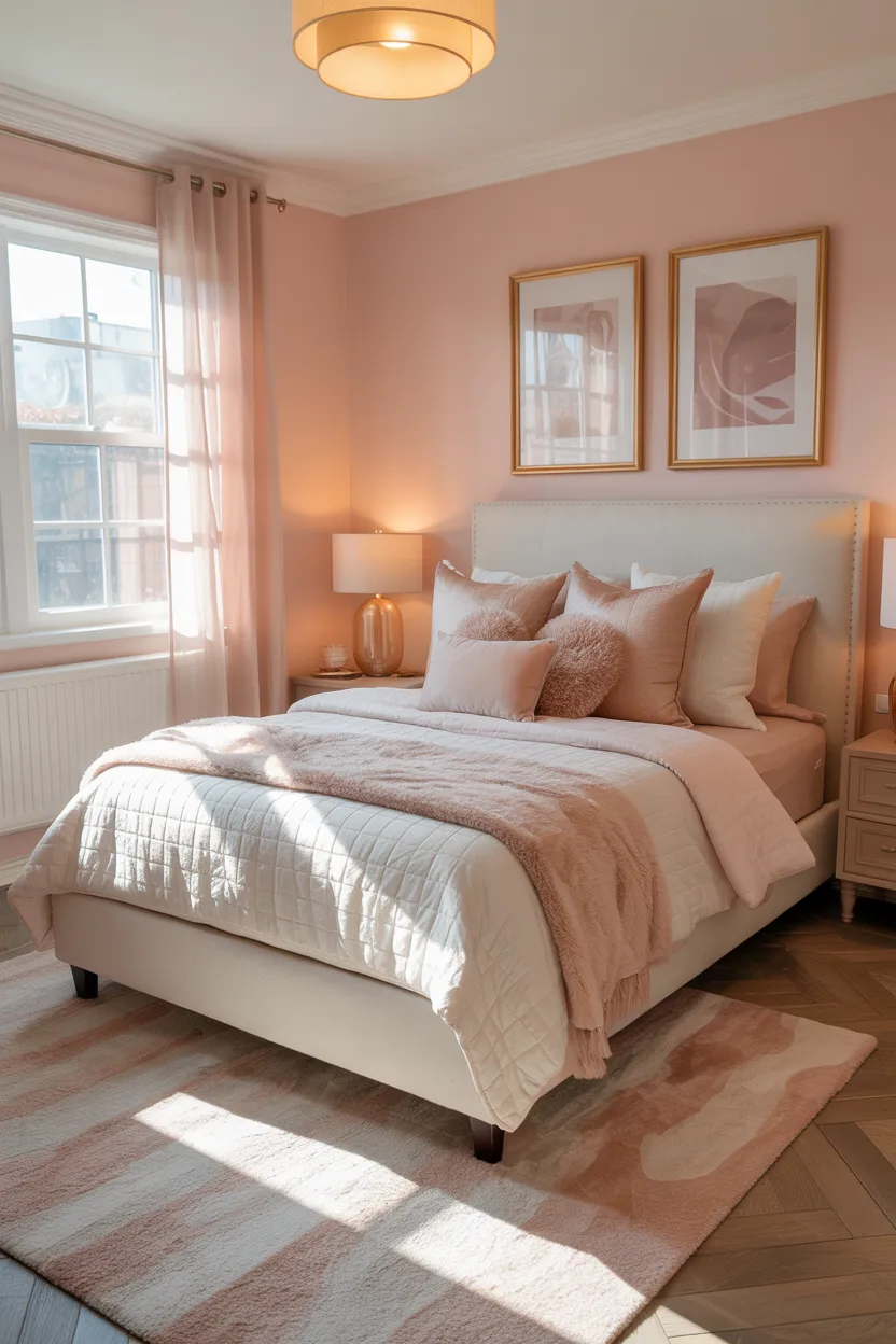 A blush pink bedroom looks especially pretty with layered bedding, fluffy throw pillows, and soft curtains that add texture without stealing the attention from the walls. You can also mix in cream, beige, or light gray if you want the room to feel a little more mature. The result feels sweet, stylish, and very easy to love.