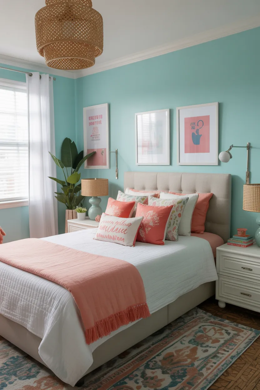 I like soft turquoise because it has a fresh almost beachy vibe, but it can still look polished if you style it carefully. Pair it with white furniture and bedding, then add a few coral, pink, or gold accents to warm it up. The room ends up feeling cheerful without looking chaotic.