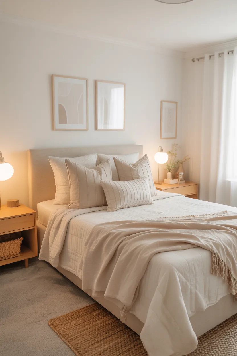 To keep cream beige from feeling too plain, focus on layers. Add knit throws, textured cushions, woven baskets, framed art, and warm lighting. Those details turn a simple neutral room into a space that feels cozy, cute, and finished.